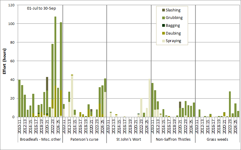 Most effort (101 h; 46% of total) was spent on the group of uncategorised low to medium risk broadleaf weeds* largely in Weetangera paddock. This was followed at a distance by Paterson's curse and St. John's Wort (both 41 h, 18%), then non-Saffron thistles (15 h, 7%). All other weeds combined accounted for less than 20% of effort.