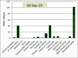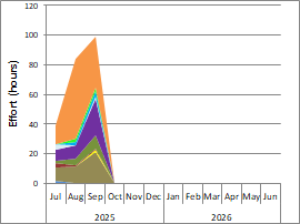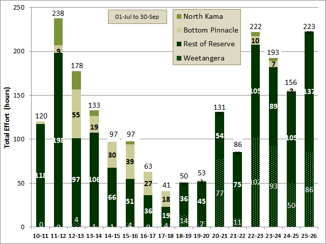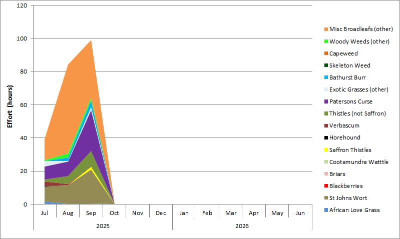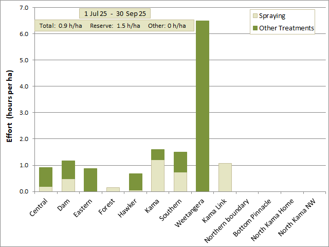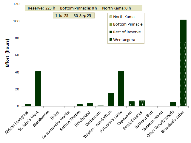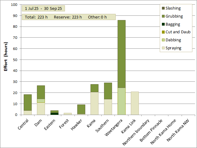 Between 1 July 2025 and 30 September 2025 the total amount of effort spent on weed control was 223 hours, all within the Reserve.