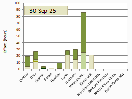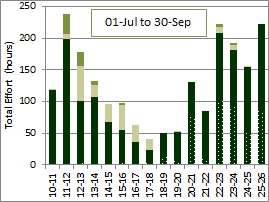 This was 42% more than last season and 80% more than the average for the previous 15 seasons of monitoring. When Weetangera paddock is excluded from calculations (as explained below *) effort for the rest of the Reserve was 31% more than last season and 71% more than the average for the previous 15 seasons.