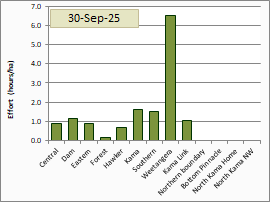 It can be seen that Weetangera paddock received the greatest effort, followed by Southern, Kama, Dam, Kama Link, Central, Hawker, Eastern and the Forest.