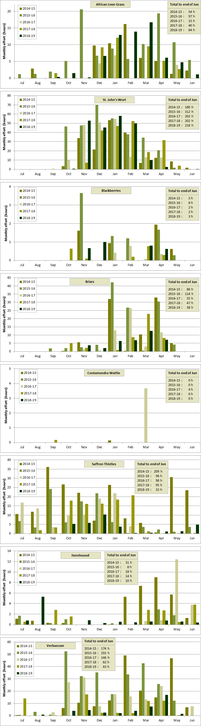 Monthly weeding effort for each weed type compared with previous seasons