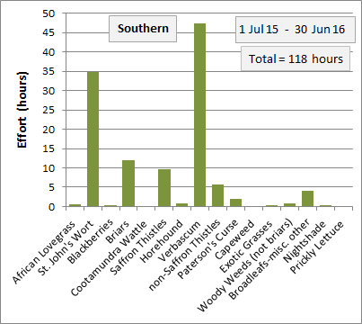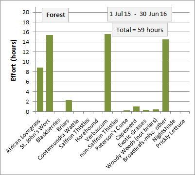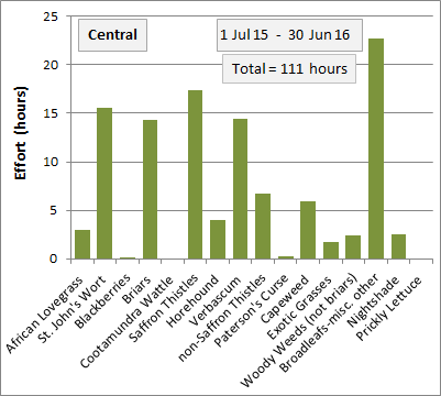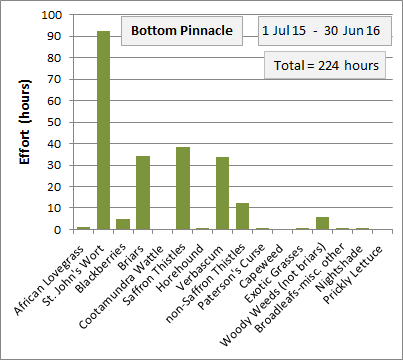 Hover your mouse over the paddock names on the map below to show charts of the effort for each weed type in each paddock. For another view of the relative prevalence of each weed type across different parts of The Pinnacle Nature Reserve and neighbouring paddocks, see charts for each weed type comparing the effort per hectare in each paddock.