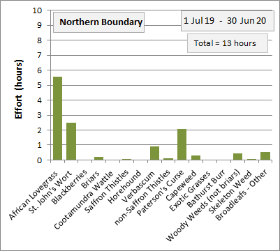 Hover your mouse over the paddock names on the map below to show charts of the effort for each weed type in each paddock. For another view of the relative prevalence of each weed type across different parts of The Pinnacle Nature Reserve and neighbouring paddocks, see charts for each weed type comparing the effort per hectare in each paddock.