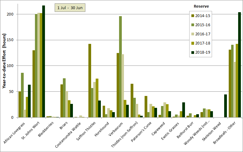 More effort to date this season on the exotic grasses such as oats, particularly in Weetangera paddock where there is an increased effort to control them after the hazard reduction burn early in 2018. |