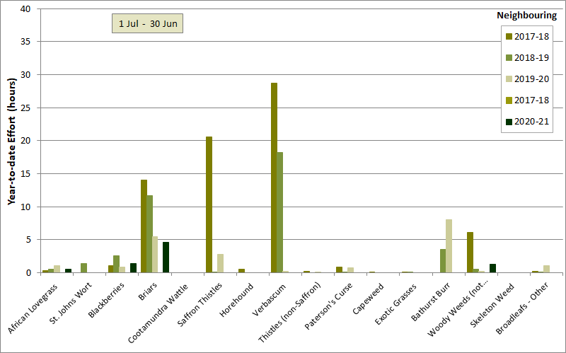 Effort has been much less than last season (when considerable effort was expended in an attempt to control it in Weetangera paddock) but about about the same as previous seasons. |