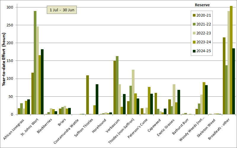 This category includes a range of low to medium risk weeds such as Hoary mustard, Prickly lettuce, fleabane, flatweed, catsear, Tragopogon, plantain, etc. Less effort in Weetangera paddock this season, largely because not required as a result of the amount and timing of rainfall. |